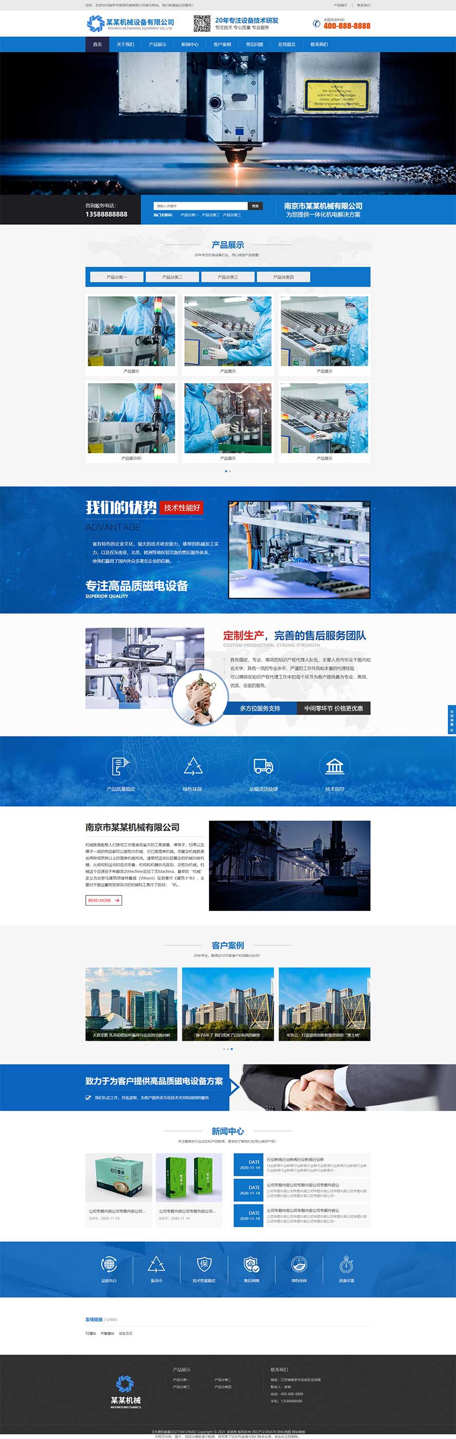 这套响应式营销型一体化机电机械设备类网站源码,默认开设网站首页、关于我们、产品展示、新闻中心、客户案例、常见问题、在线留言、联系我们等6个栏目,支持增删改栏目名。顶部左边是网站欢迎词,右边是联系方式链接,下方左边网站名,中间是二维码和网站服务口号,右边是400全国咨询热线,下方是导航条,支持二级下拉子菜单和字体高亮效果,然后两张可以切换的通栏轮播图图。