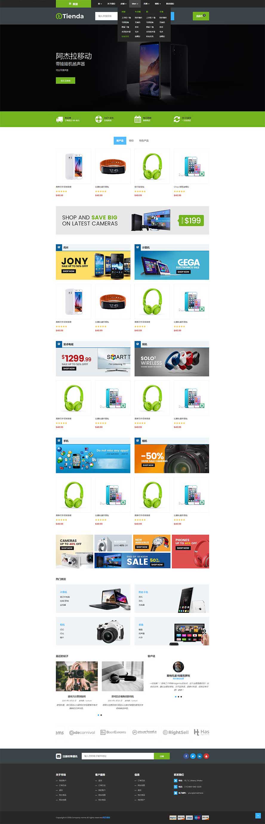 这套响应式手机电脑数码电子产品商城html5静态模板,默认拥有网站首页、关于我们、产品店铺、衣帽店铺(MEN)、单页面、博客新闻、联系我们等几个类型页面。本模板首页主要功能有特色产品、热门类别、最近的帖子、客户说、注册时事通讯、客户服务、关于市场等几个功能区,本HTML网站模板特别适合开发数码商城类电商网站。