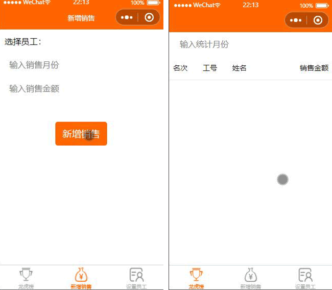 这套公司销售部龙虎榜单竞争PK小程序模板,可以用于开发团队销售类微信小程序,具有龙虎榜、新增销售、设置员工等几个功能,漂亮的构思让产品的呈现更为大方得体,特别适合各种商家运营选用,包括十分详尽完善的框架架构设计!有利于开发设计和仿效自学选用!